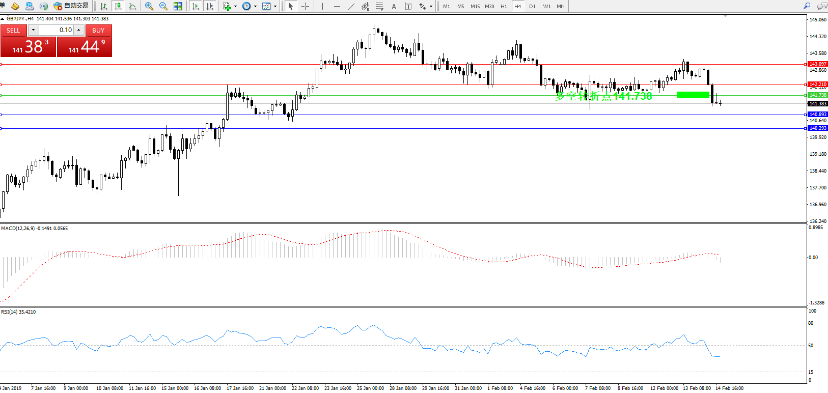 交易策略:141.738下方看跌,目标140.893、140.293