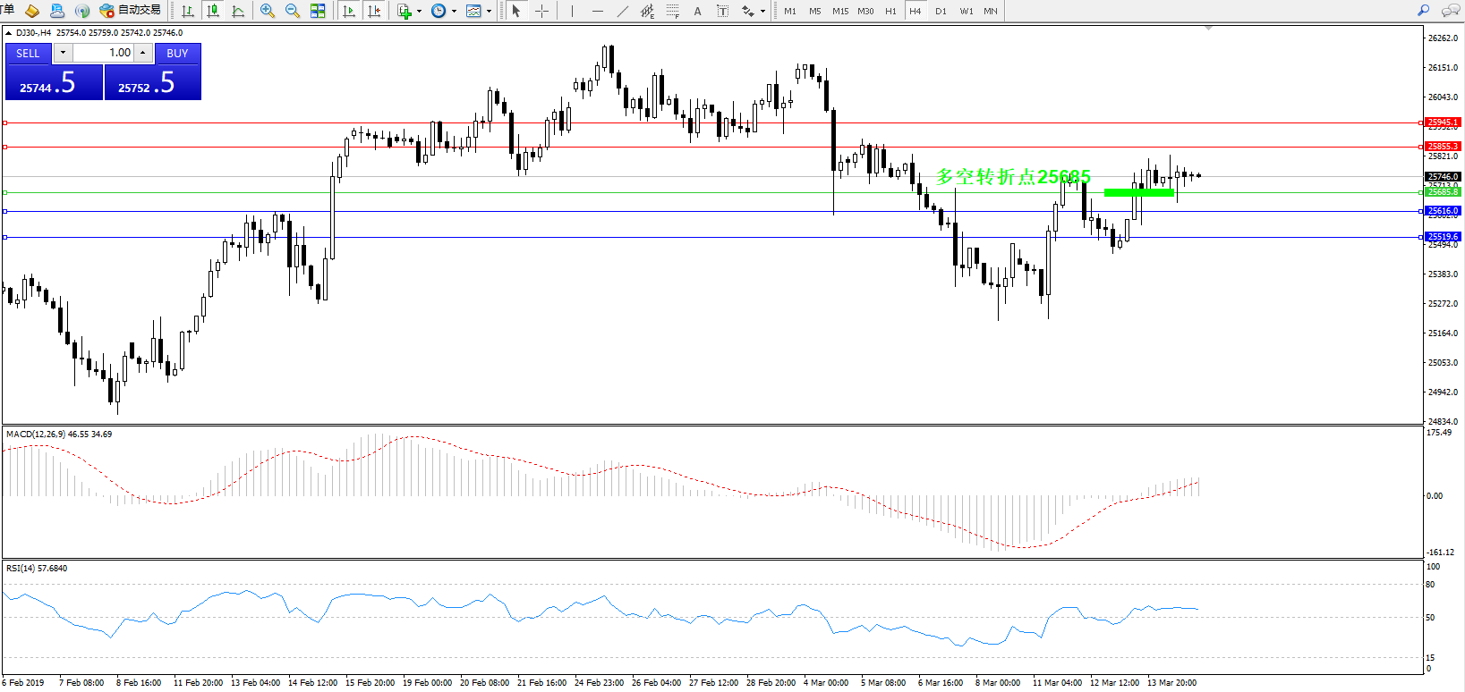 道琼斯指数DJ30—— 4小时K线图显示: