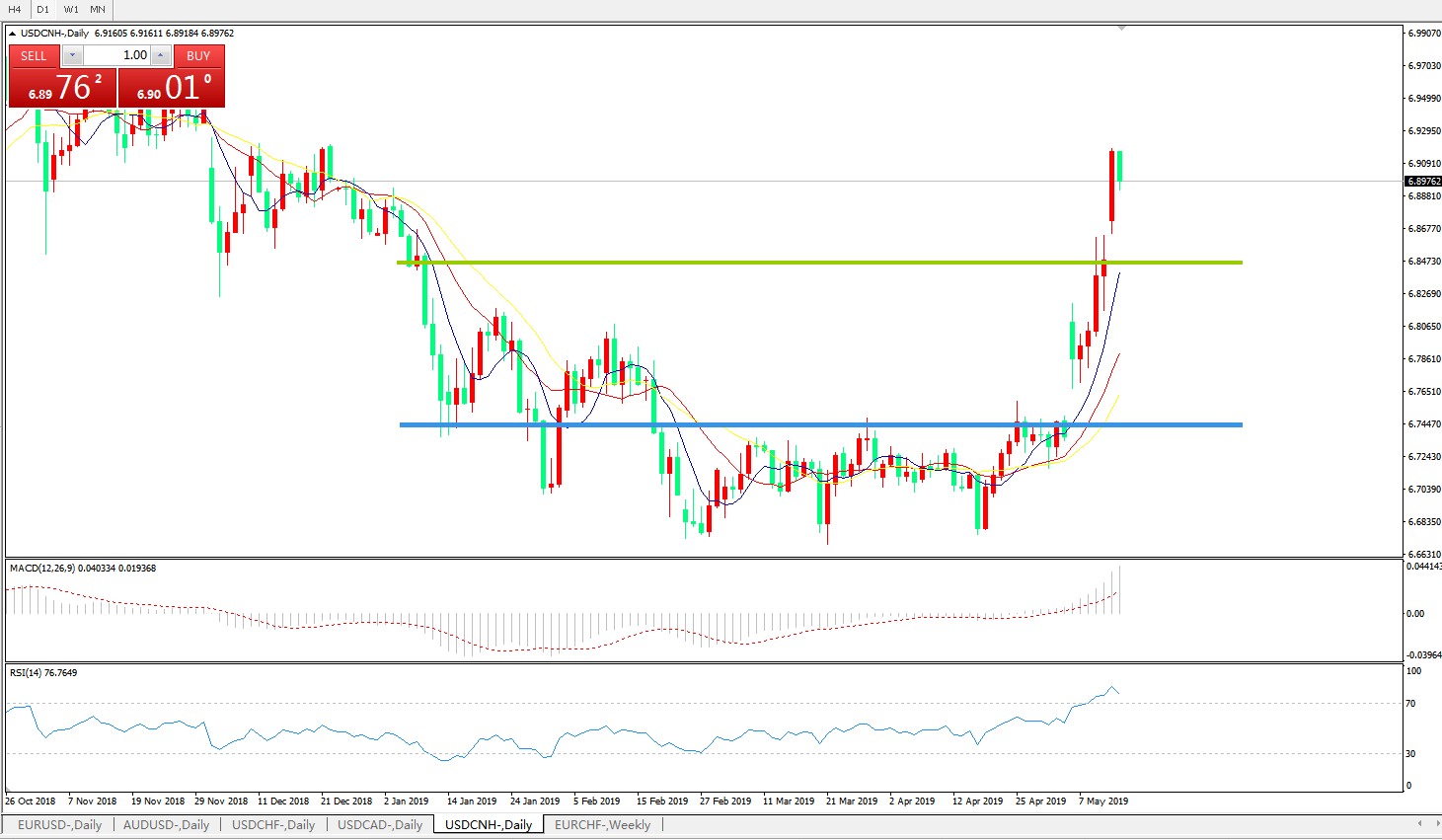 技术面简析:日线图均线呈有序多头排列看多,MACD在0轴上方运行且动能柱0轴上方快速放量,RSI快速走升后小幅回落,汇价企稳多空转折区域维持强力攻势,预计短期汇价有进一步上行空间,重点关注中美贸易争端后续进展。