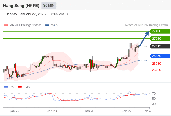 在 26930 之上,看涨,目标价位为 27260 ,然后为 27400 。