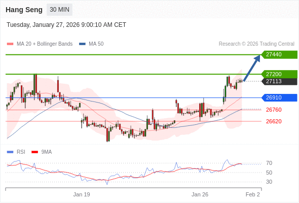 在 26910 之上,看涨,目标价位为 27200 ,然后为 27440 。