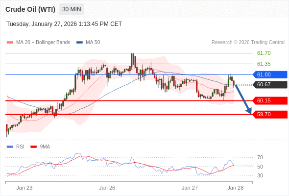 交易策略: 在 61.00 之下,看跌,目标价位为 60.15 ,然后为 59.70 。