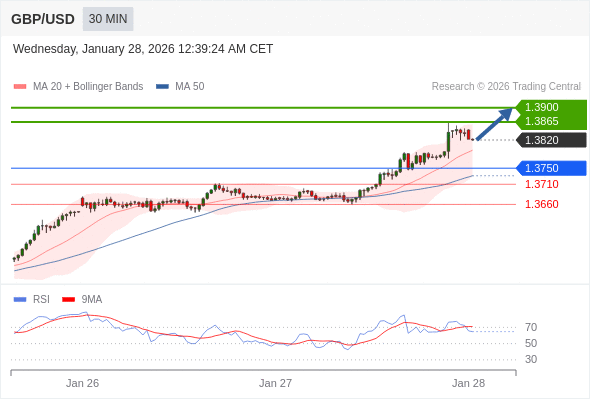 在 1.3750 之上,看涨,目标价位为 1.3865 ,然后为 1.3900 。