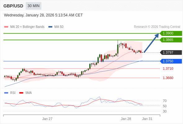 在 1.3750 之上,看涨,目标价位为 1.3865 ,然后为 1.3900 。