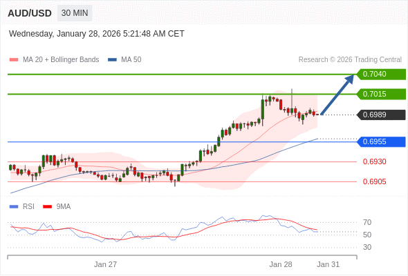 在 0.6955 之上,看涨,目标价位为 0.7015 ,然后为 0.7040 。