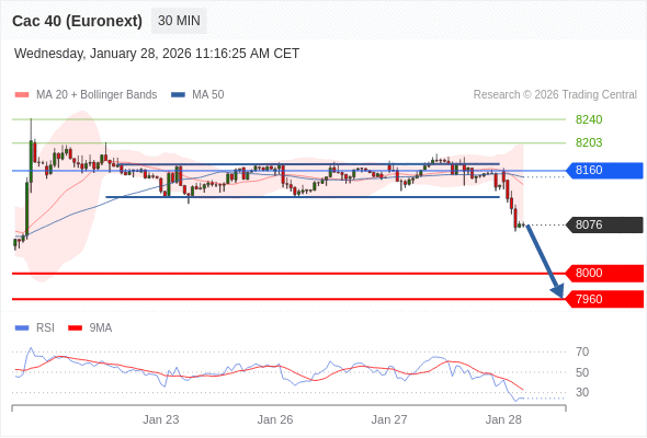 法国CAC指数期货 (Euronext) (G6) 当日内: 存在压力。