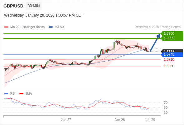在 1.3745 之上,看涨,目标价位为 1.3865 ,然后为 1.3900 。