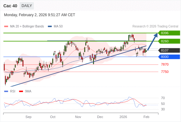 交易策略: 在 8000 之上,看涨,目标价位为 8260 ,然后为 8396 。