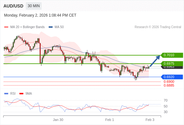 在 0.6920 之上,看涨,目标价位为 0.6975 ,然后为 0.7010 。