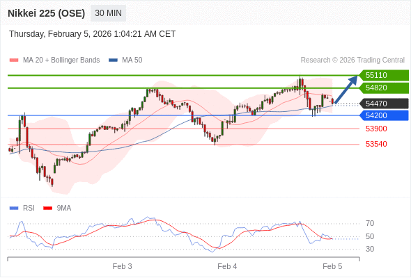 交易策略: 在 54200 之上,看涨,目标价位为 54820 ,然后为 55110 。