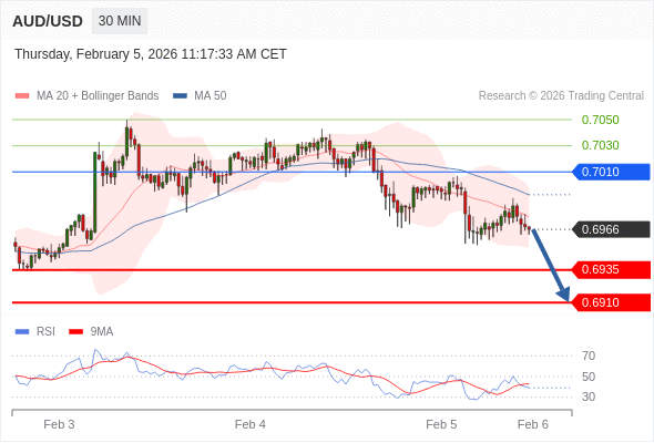 在 0.7010 之下,看跌,目标价位为 0.6935 ,然后为 0.6910 。