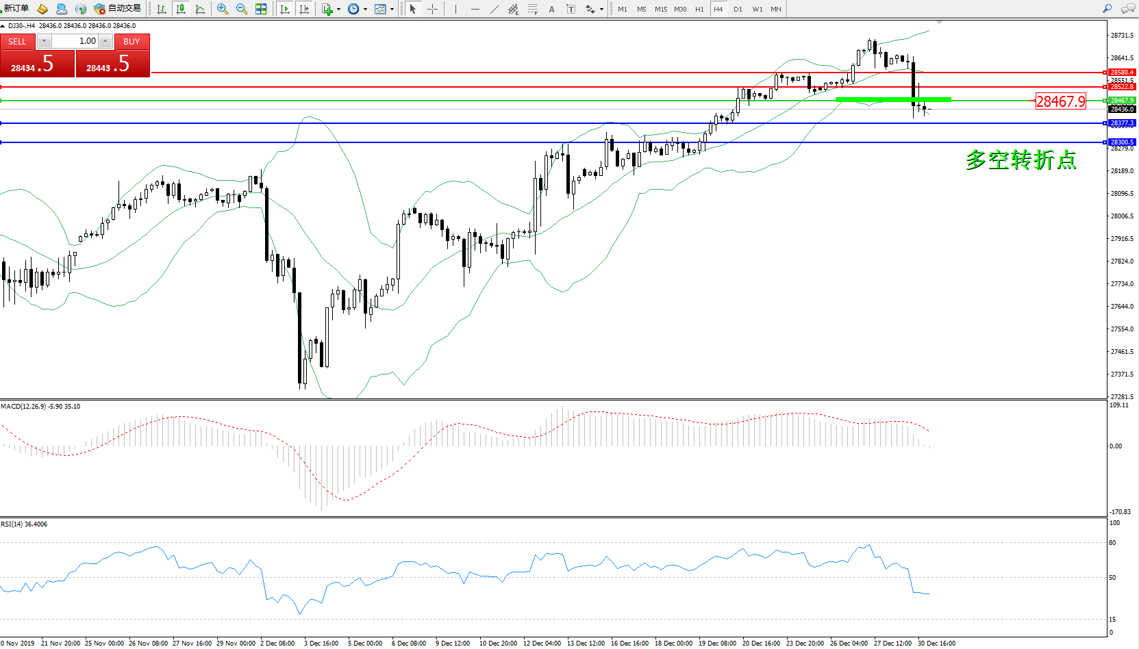 道琼斯指数DJ30—— 4小时K线图显示: