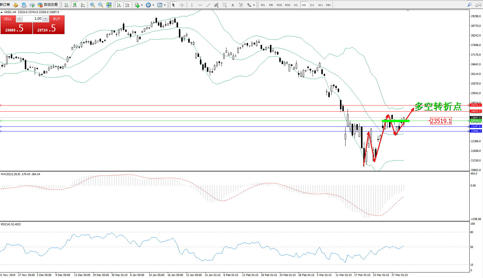 恒指HK50 ——4小时K线图显示: