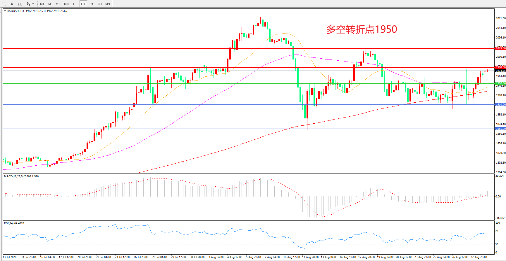 备选策略: 在1950.00之下看跌,目标1910.00 1865.00
