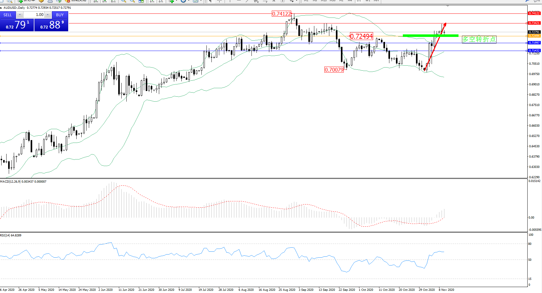 交易策略:0.72494上方看涨,目标0.73421、0.74122