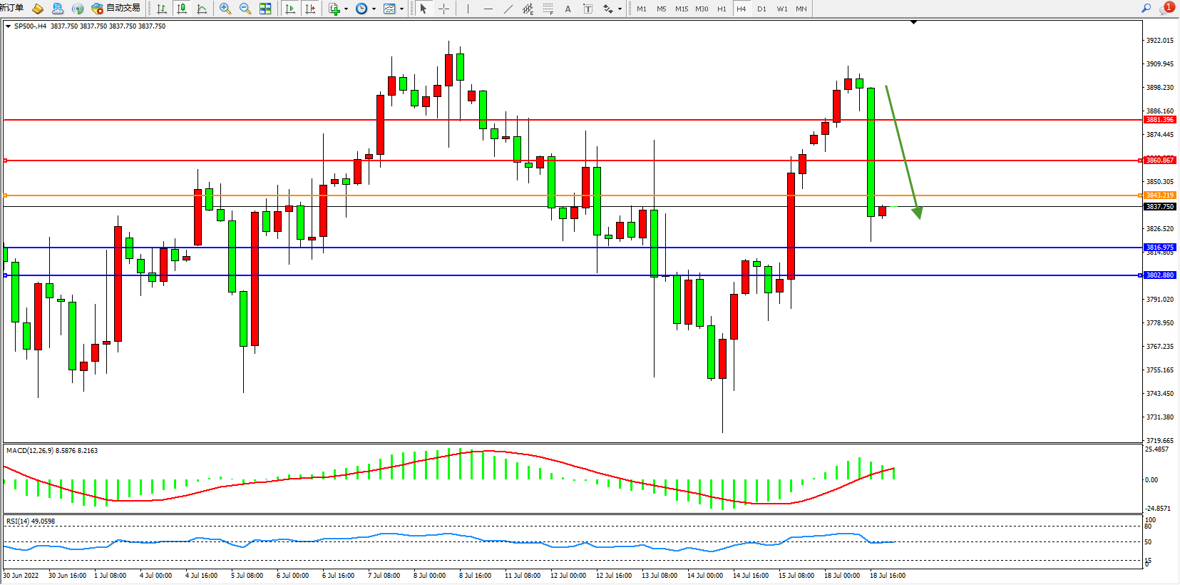 标普SP500——4小时K线图显示: