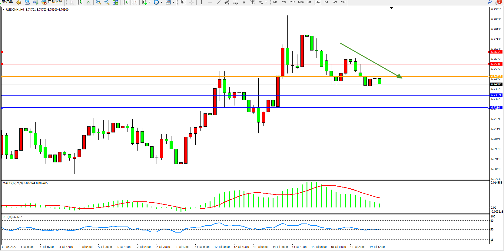 交易策略:6.74825下方看跌,目标6.73524、6.72664