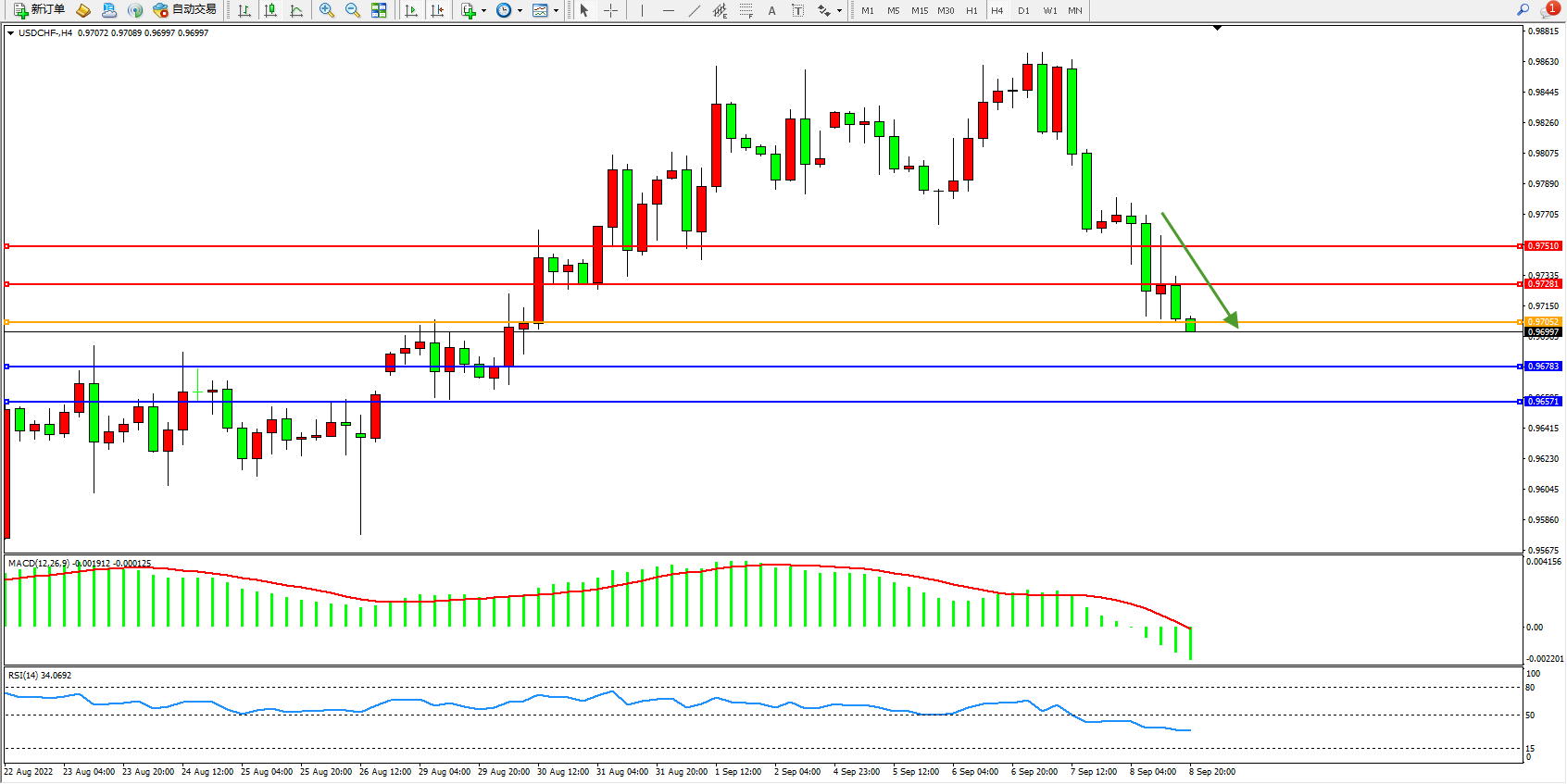 美元瑞郎USDCHF——4小时K线图显示: