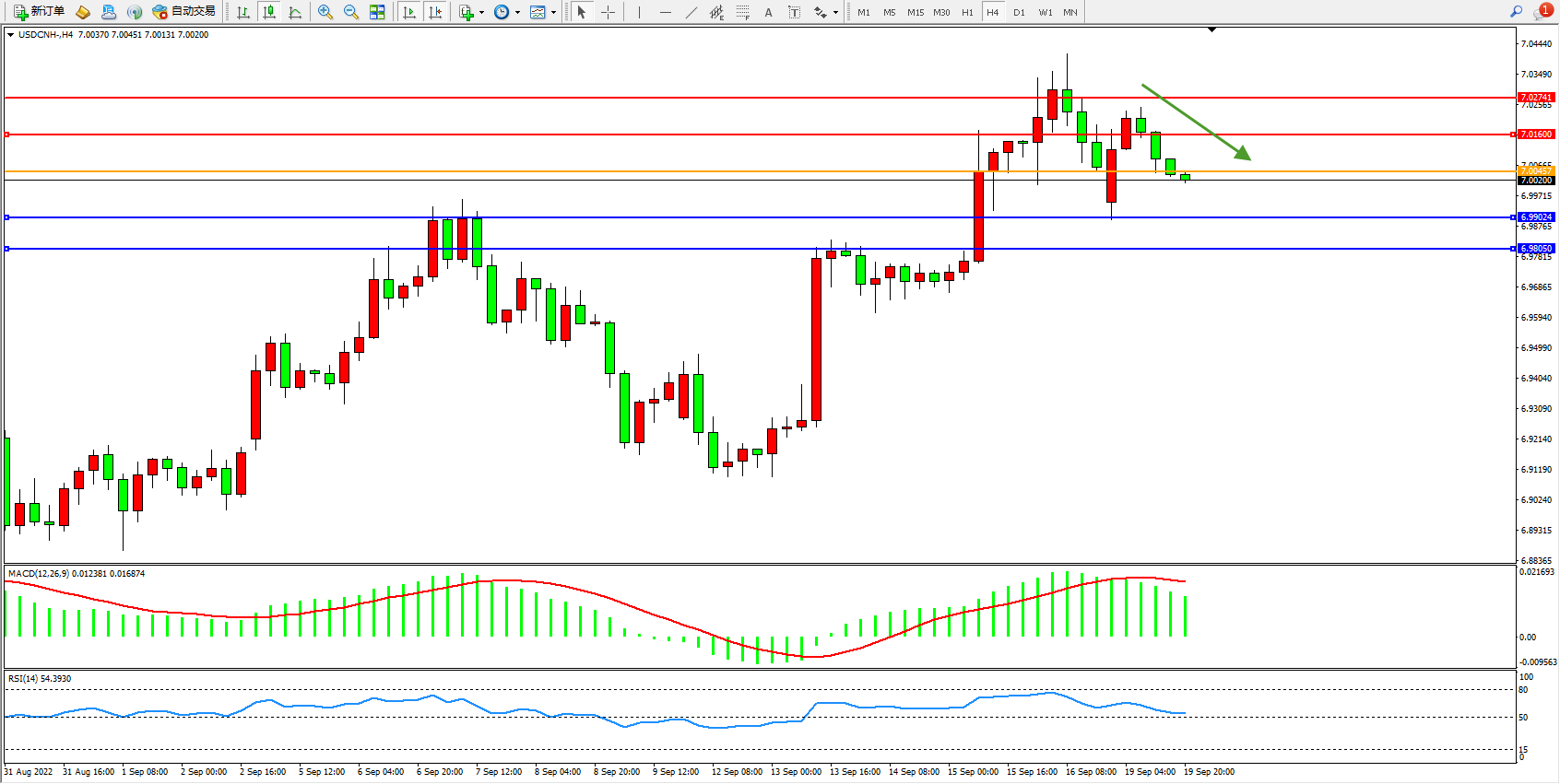 交易策略:7.00457下方看跌,目标6.99024、6.98050