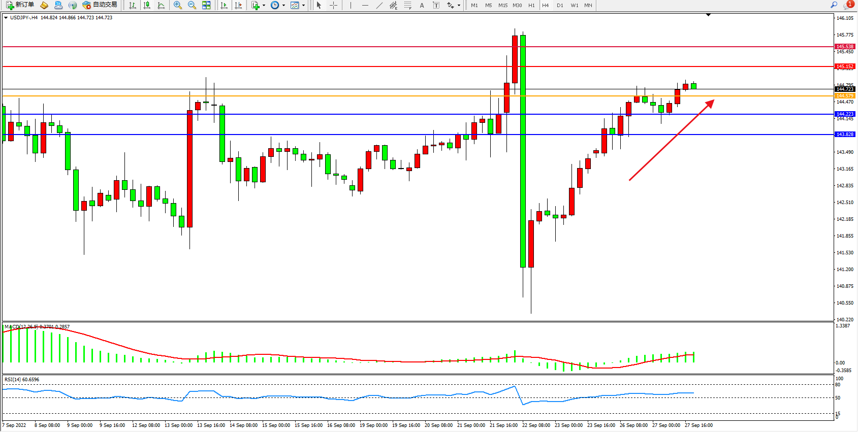 交易策略:144.579上方看涨,目标145.152、145.538