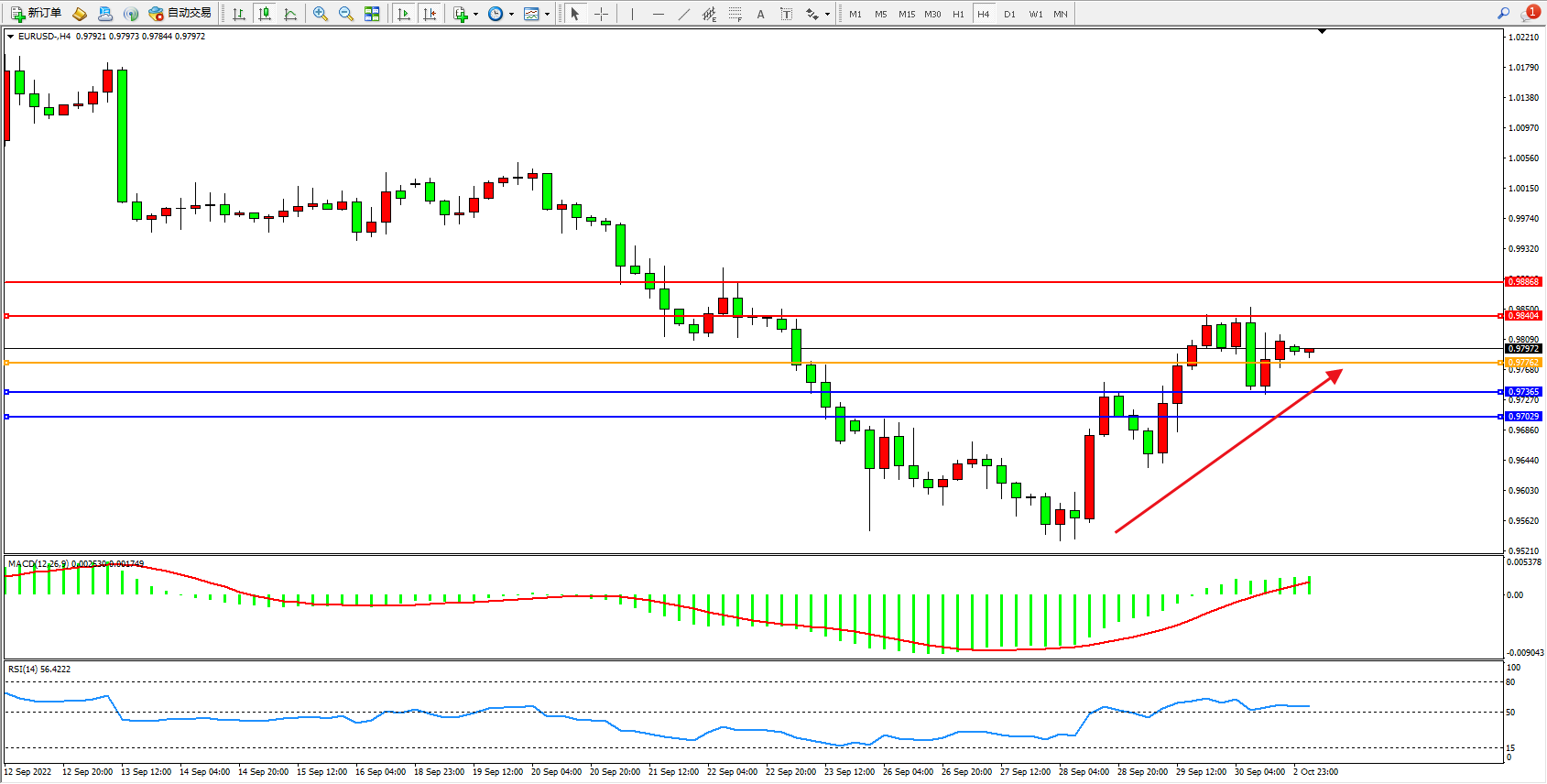 交易策略:0.97762上方看涨,目标0.98404、0.98868