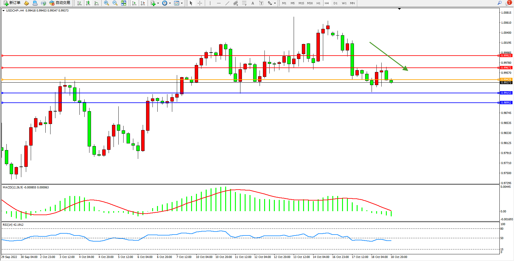 交易策略:0.99428下方看跌,目标0.99153、0.98952