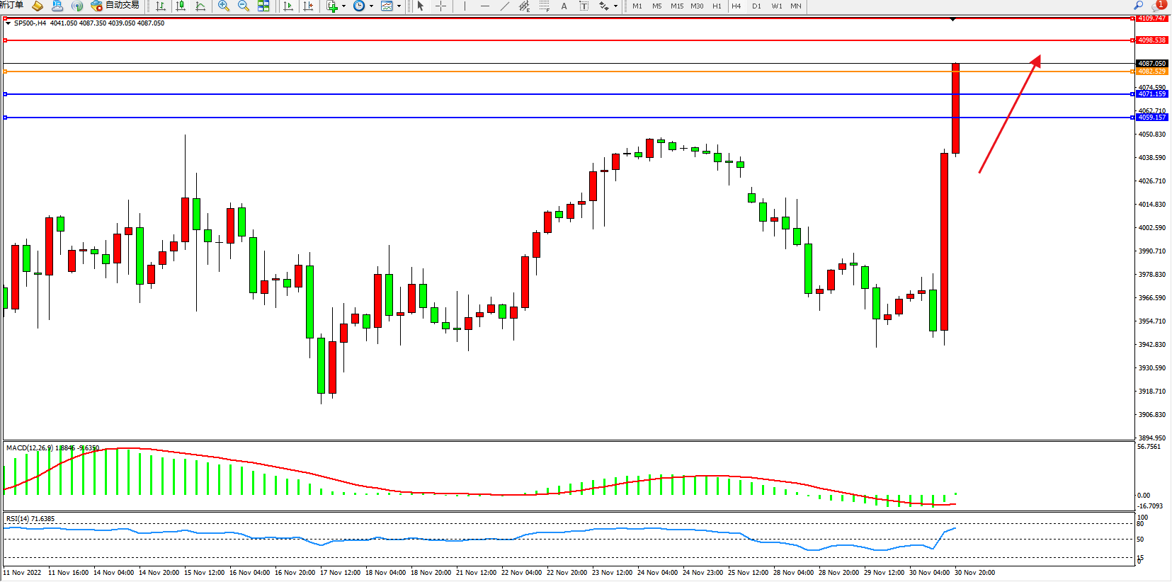 标普SP500——4小时K线图显示: