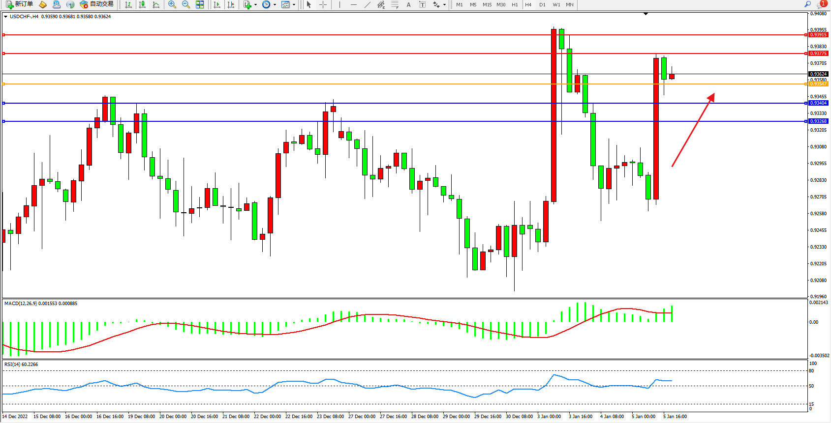 美元瑞郎USDCHF——4小时K线图显示: