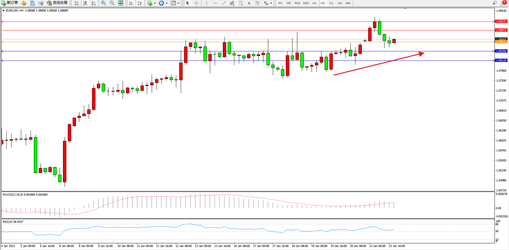 交易策略:1.08611上方看涨,目标1.08914、1.09142