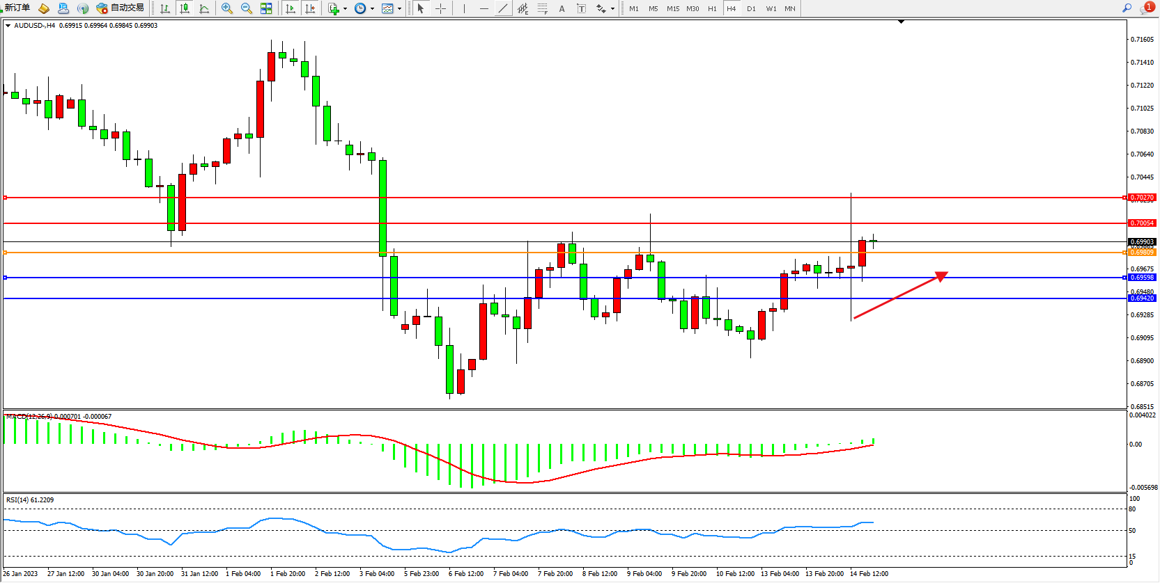 交易策略:0.69809上方看涨,目标0.70054、0.70270