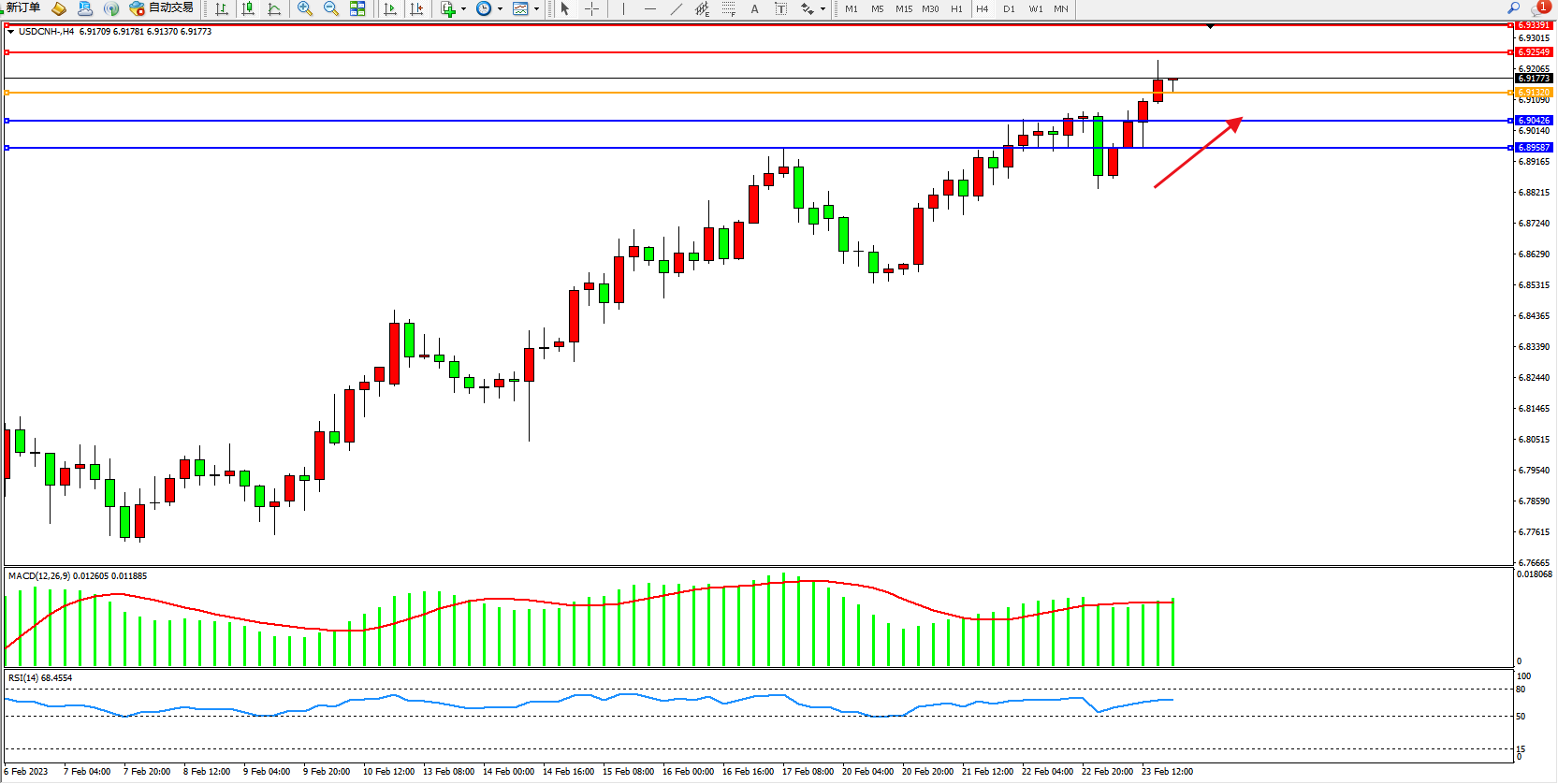 交易策略:6.91320上方看涨,目标6.92349、6.93391