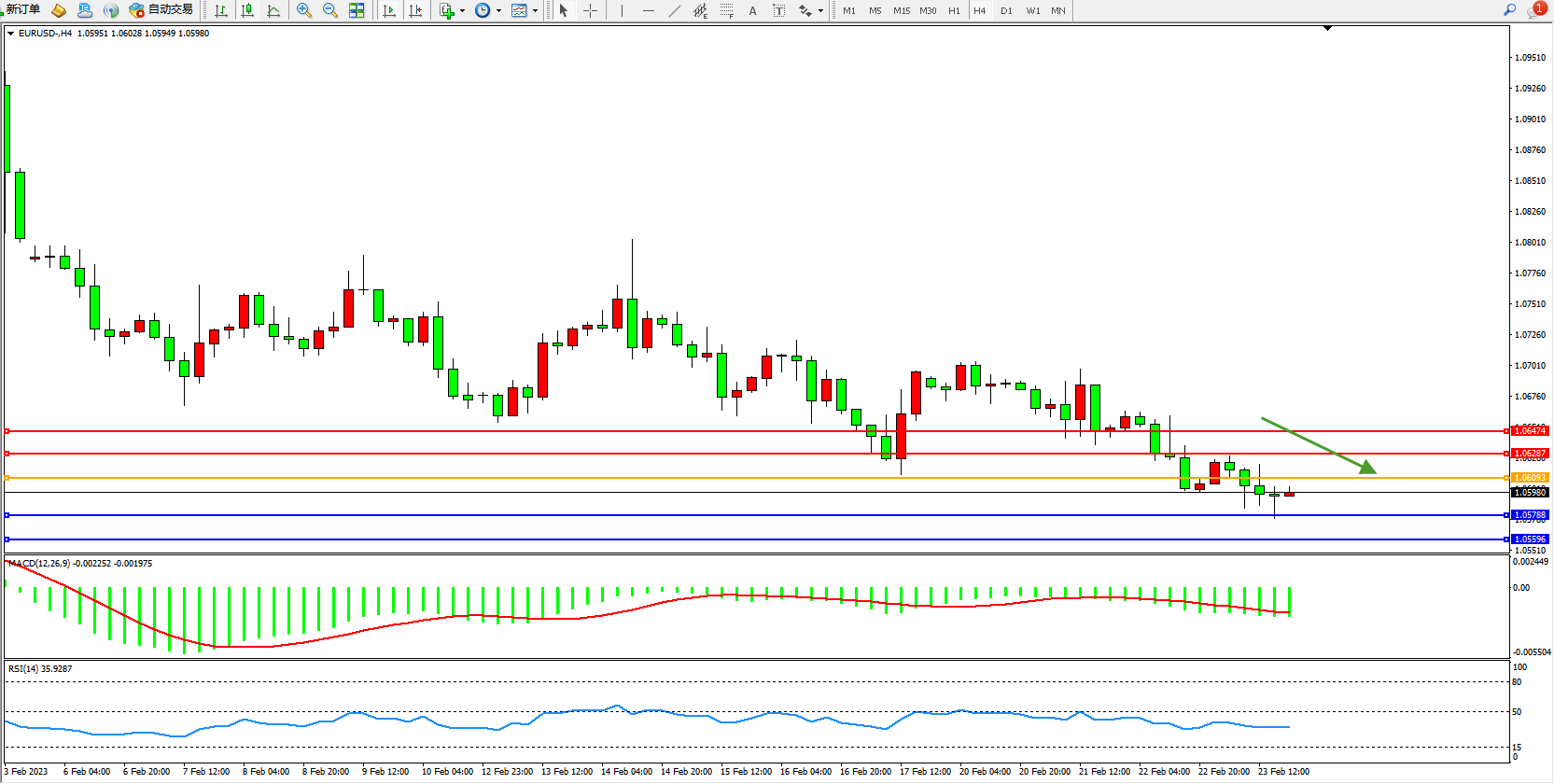 交易策略:1.06093下方看跌,目标1.05788、1.05596