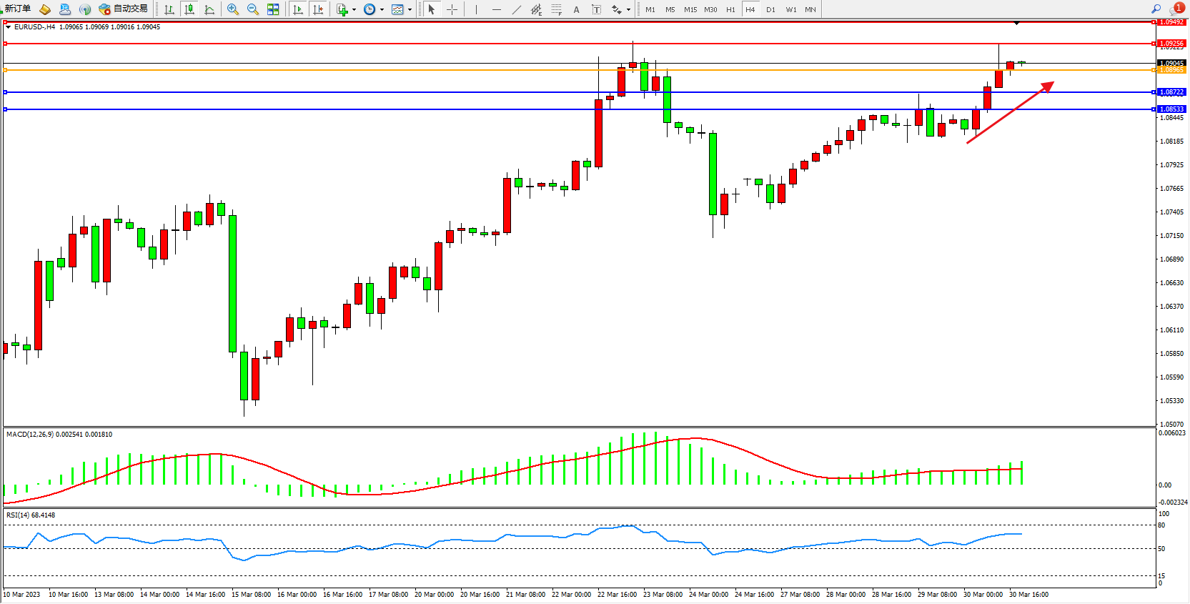 欧元兑美元维持1.09045附近震荡,市场预计欧洲央行将在5月和6月再次加息25个基点。欧洲央行的基本情况是,通胀预计将在过长时间内保持在过高水平,而最近政策制定者的言论意味着,其关键存款利率将在3.5%达到峰值,并在5月和6月分别加息25个基点。