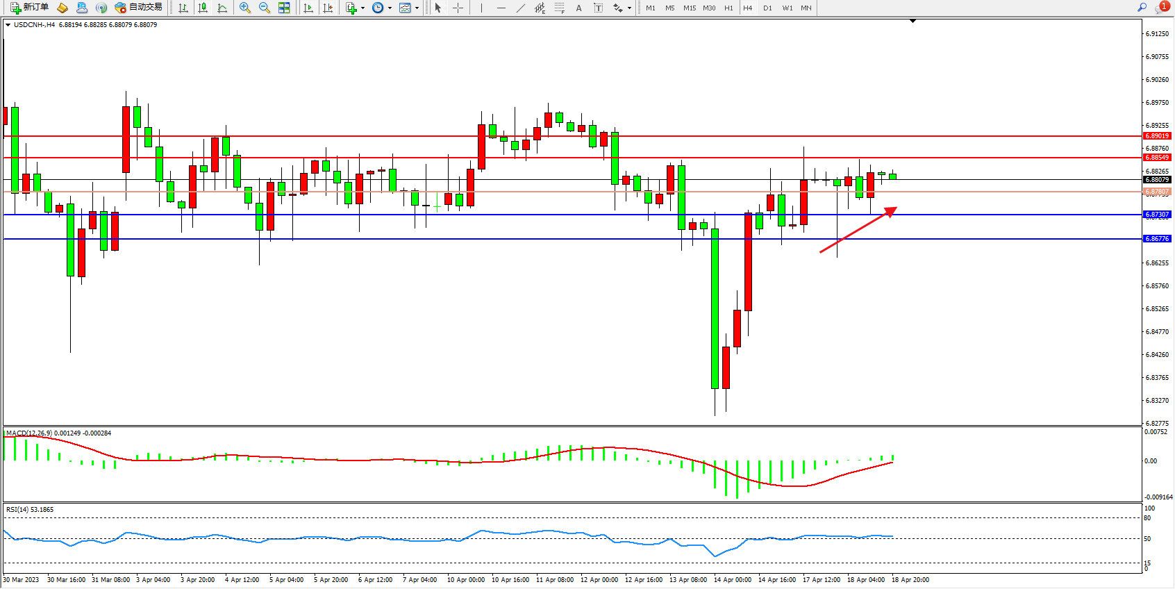 交易策略:6.87807上方看涨,目标6.88549  6.89019