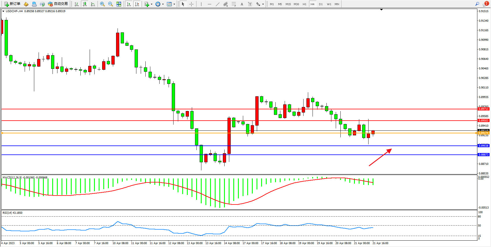 美元瑞郎USDCHF——4小时K线图显示: