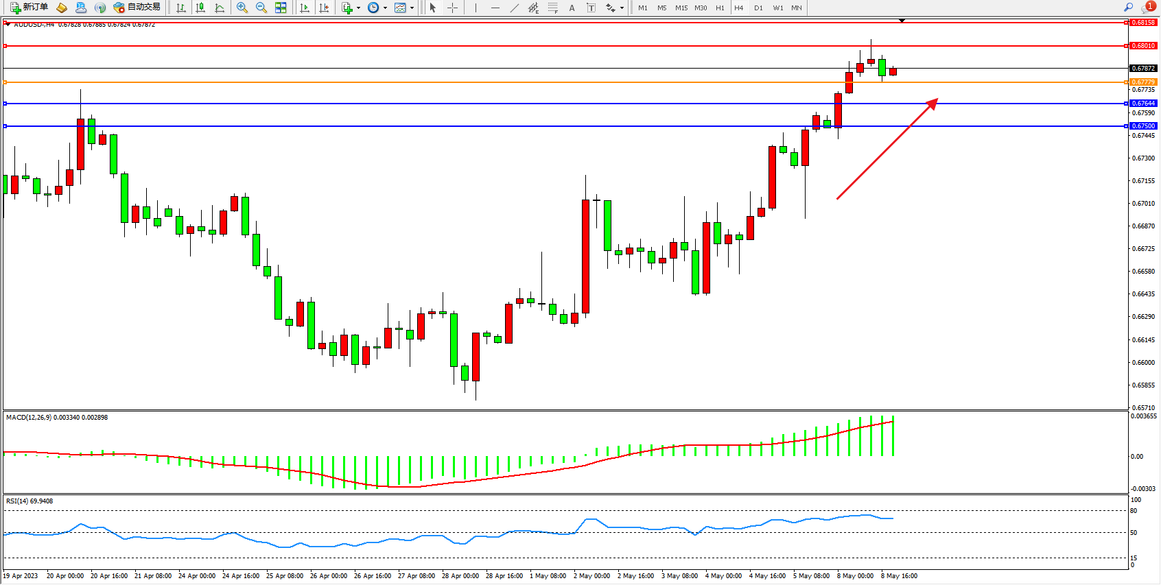 交易策略:0.67779上方看涨,目标0.68010 0.68158