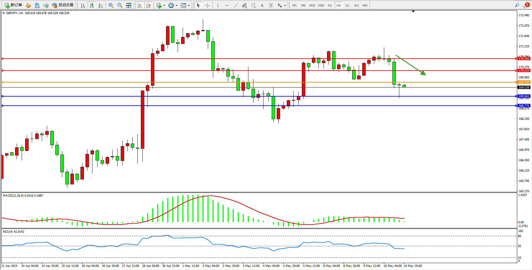 交易策略:169.739下方看跌,目标169.161  168.775