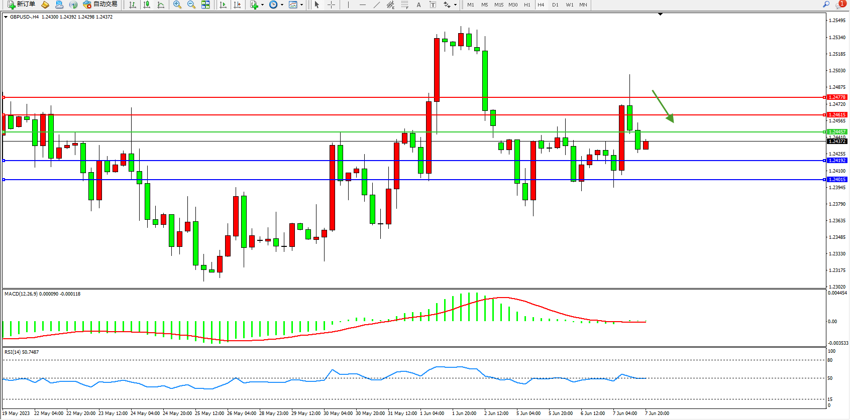 交易策略:1.24457下方看跌,目标1.24192  1.24015
