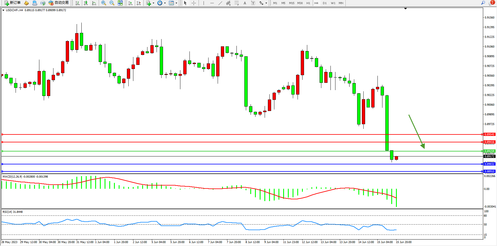 美元瑞郎USDCHF——4小时K线图显示: