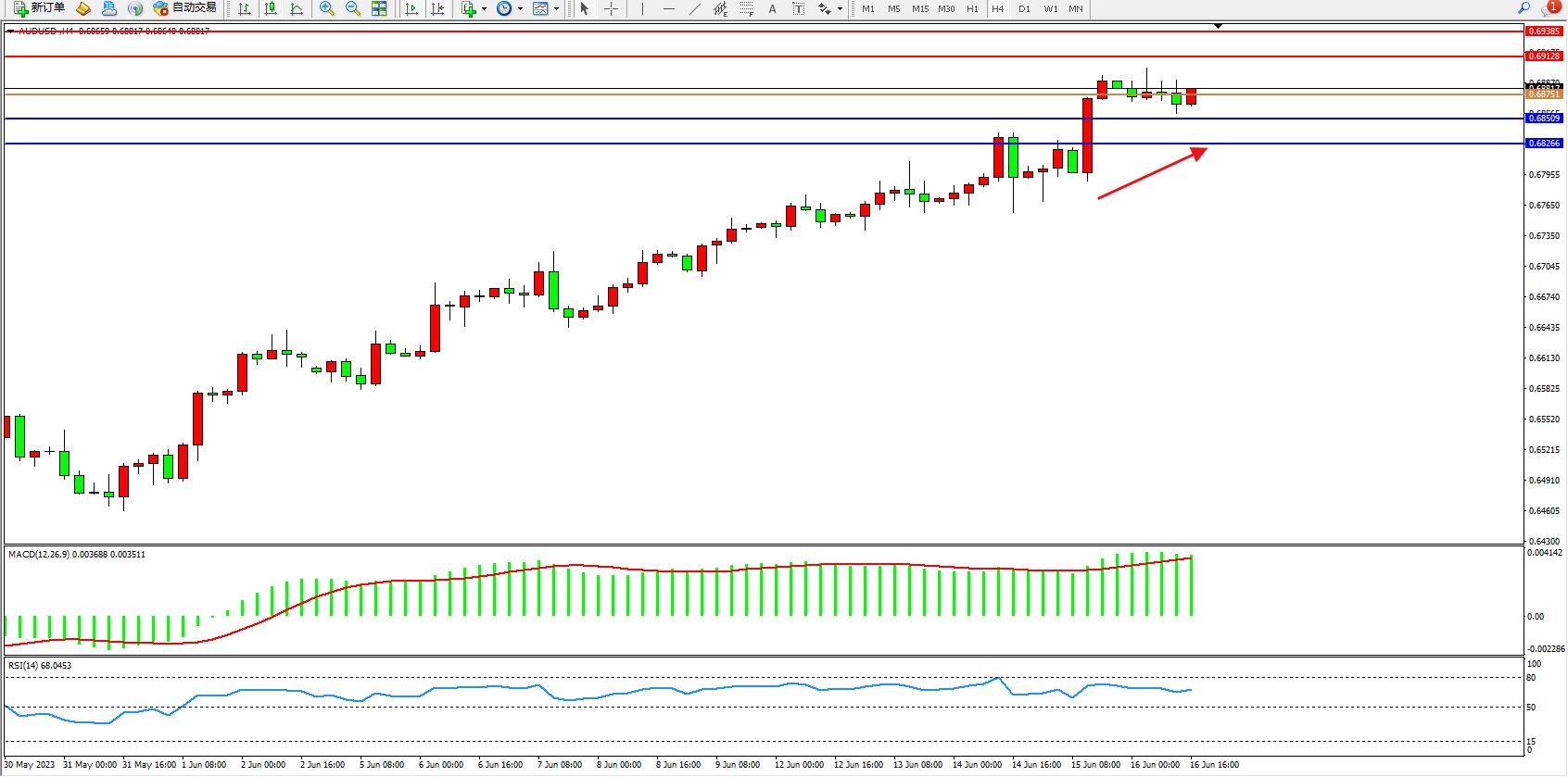 交易策略:0.68751上方看涨,目标0.69128 0.69385