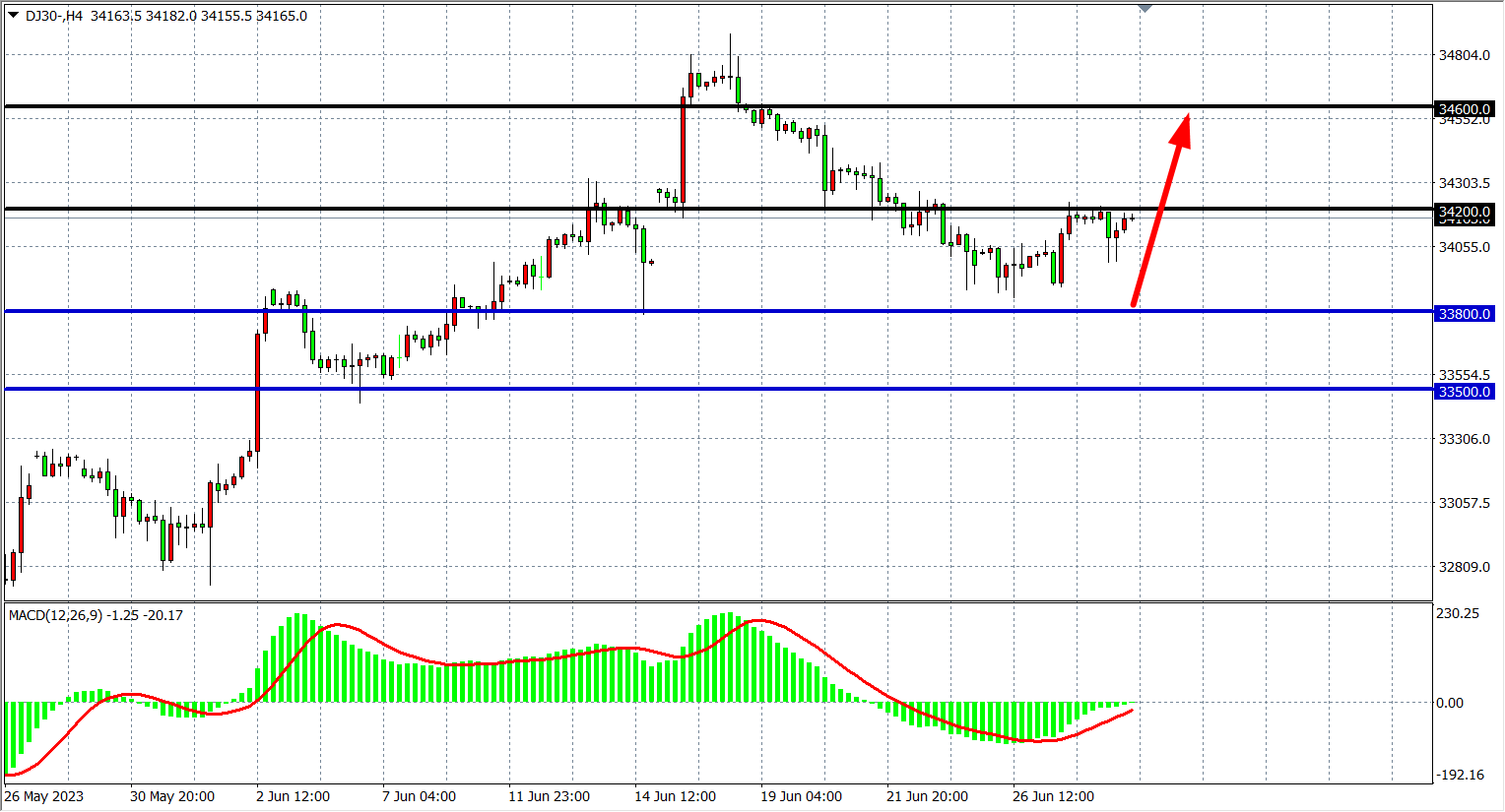 备选策略:34200 上方看涨,目标 34600 34800