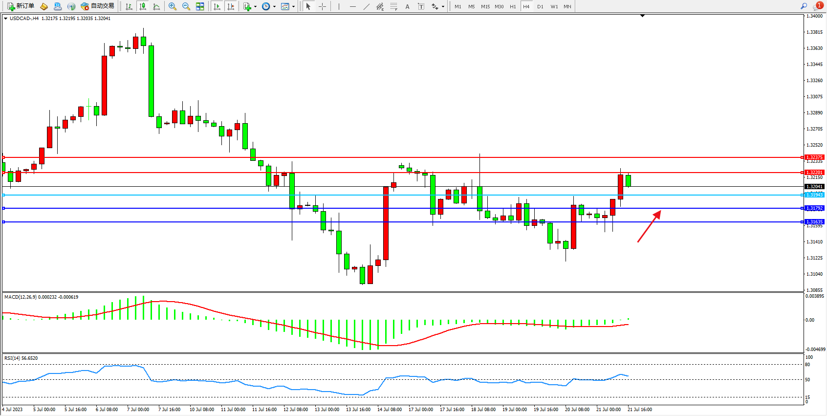 4小时图看:多头动力阶梯式震荡上行,短期看涨情绪笼罩,市场多头不断拉升中,MACD指标处于0轴线上側徘徊,RSI指标处于50均衡线上側弱势整理;