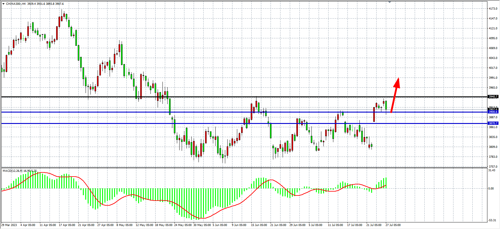 4小时图看,沪深300维持在3900之上震荡,MACD在零轴上放量,行情形成破位上攻,支撑关注3870-3900附近,上方压力看3940-3980。