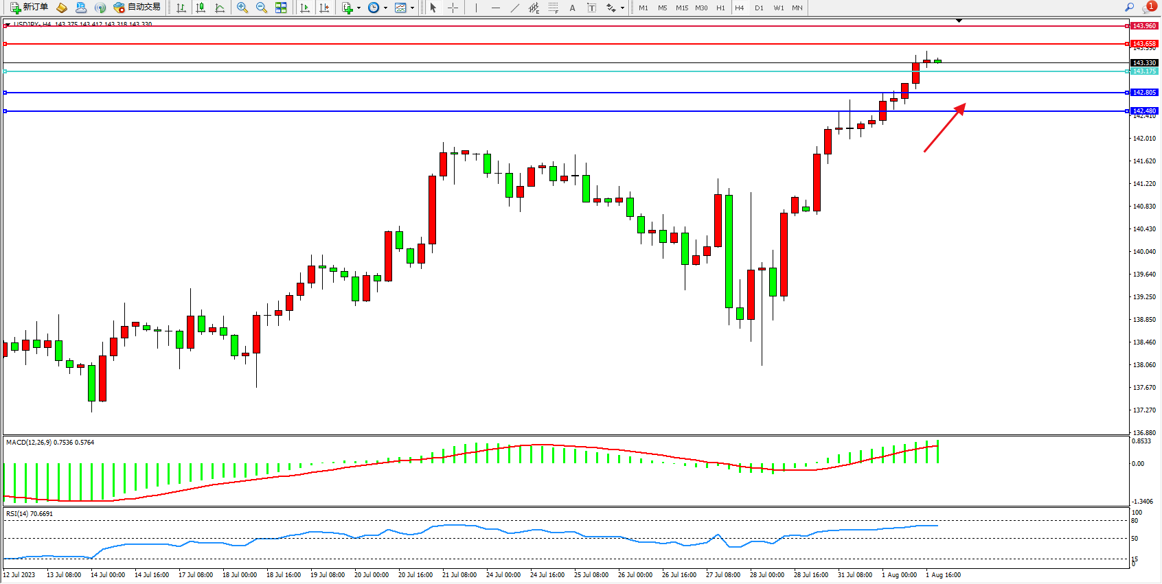 交易策略:143.175上方看涨,目标143.658  143.960