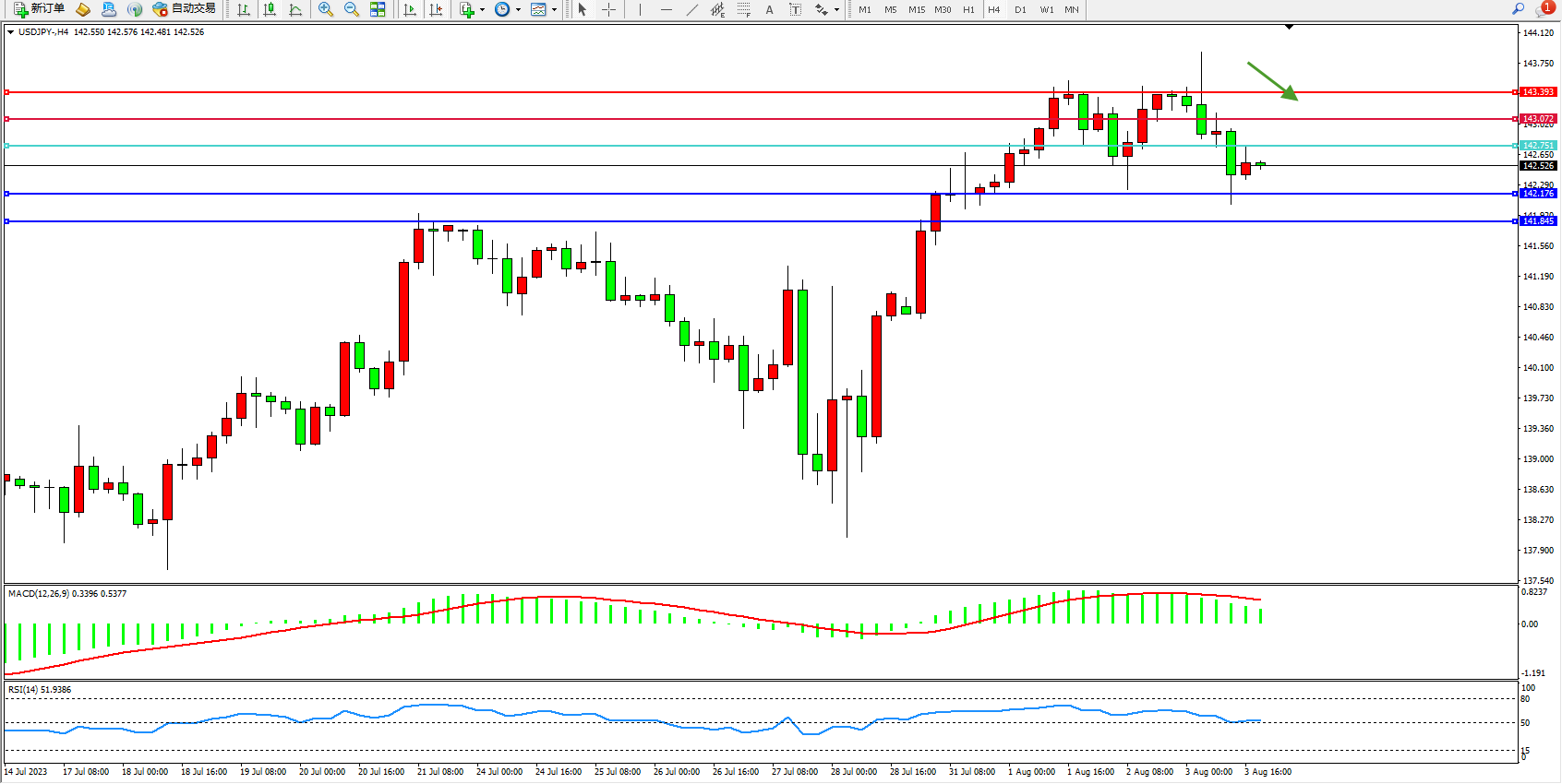备选策略:142.751上方看涨,目标143.072 143.393