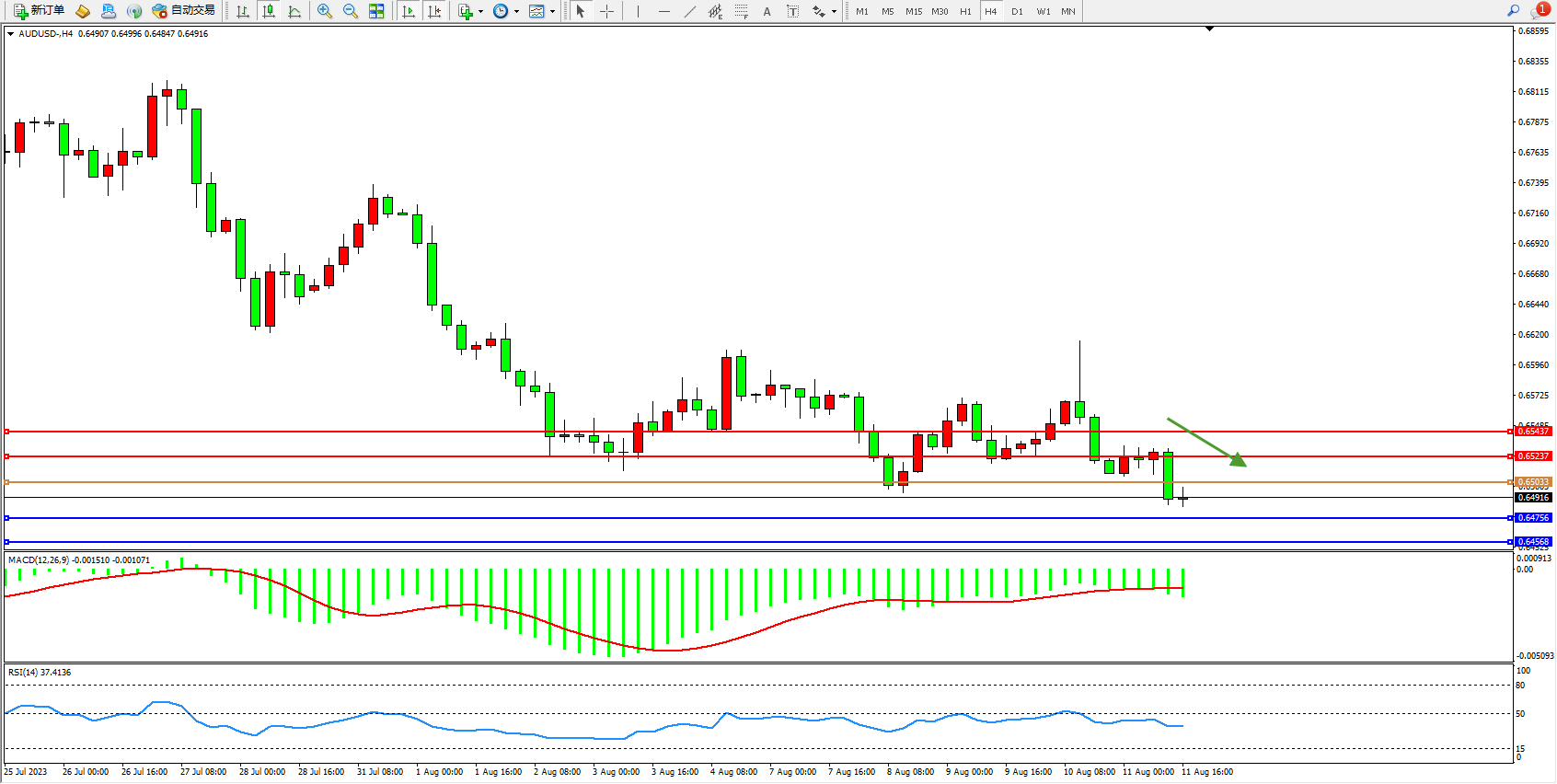 交易策略:0.65033下方看跌,目标0.64756  0.64568