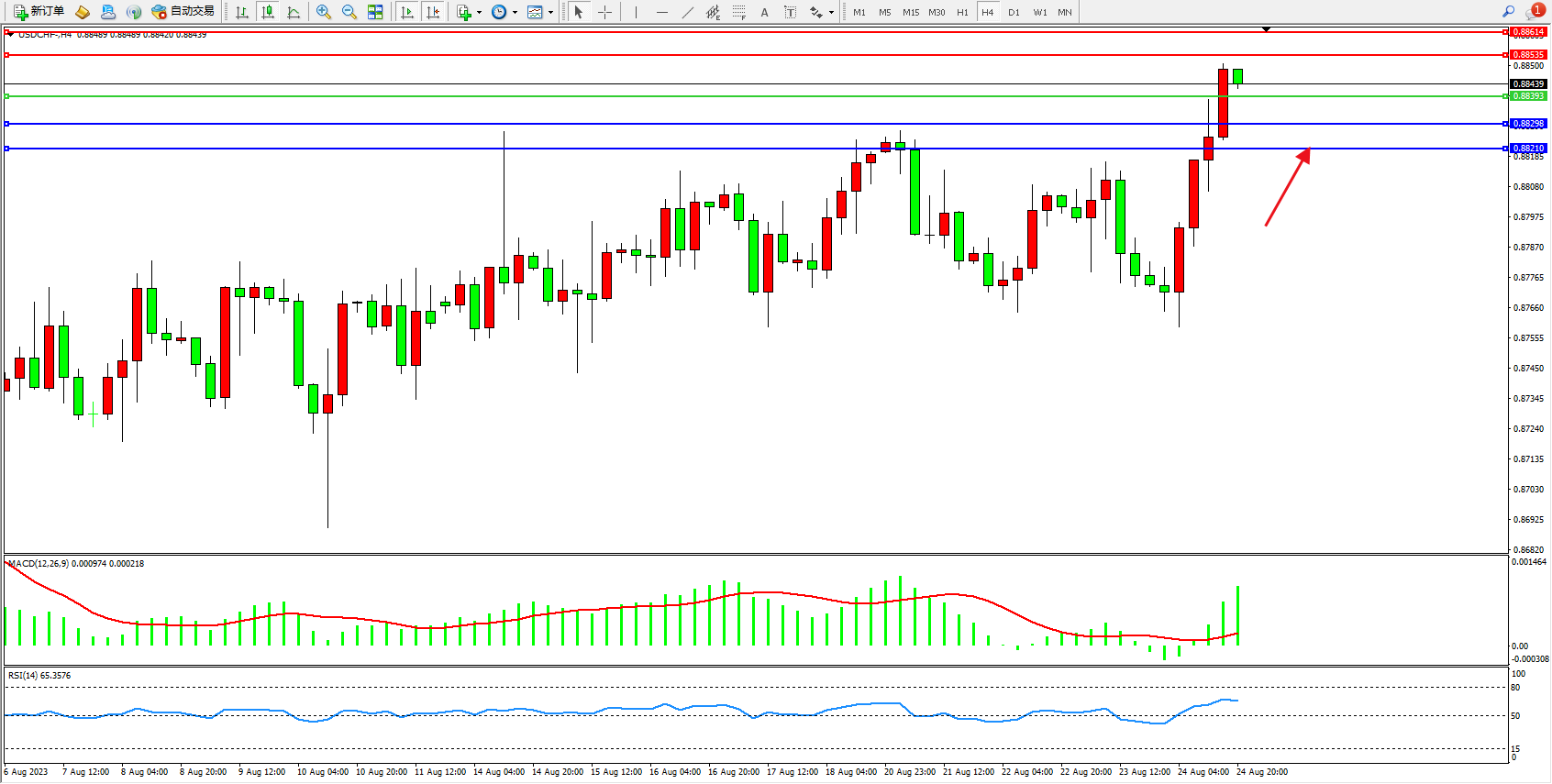 美元瑞郎USDCHF——4小时K线图显示: