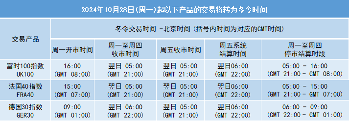 因应欧洲时区于2024年10月27日(周日)及美国时区于2024年11月3日(周日)开始分别转为冬令时间, 本公司各产品交易时间将调整为冬令时间,敬请留意。