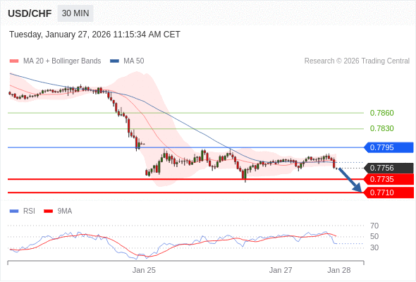 美元/瑞郎 当日内: 短期关键阻力位在0.7795。