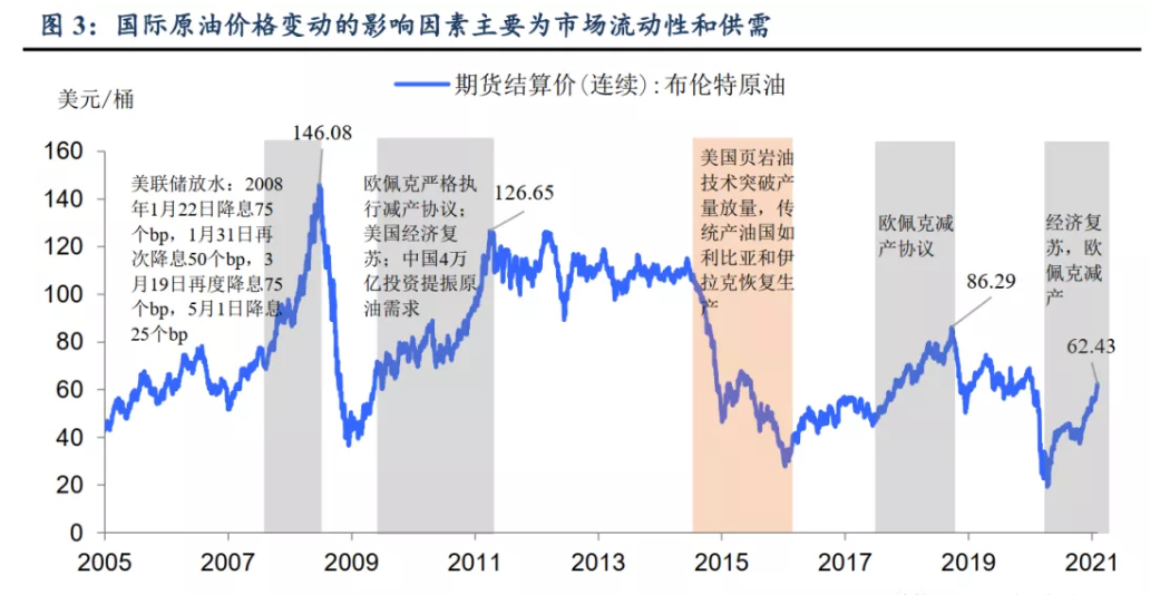 原油作为风险资产本身波动性较大,市场一旦出现油价利好信号,其上涨往往容易超出预期。复盘近年来的油价,2009-2011年、2017-2018年布伦特油价在突破60美元/桶后均出现大幅上涨,原因集中在市场流动性和原油供给上。